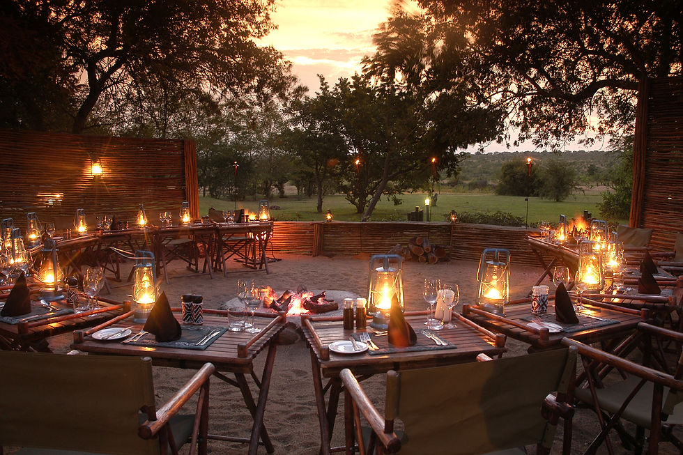 The central facilities consist of an outdoor swimming pool, a dining room, lounge, bar and an open-air boma, all overlooking a waterhole (floodlit at night) where some of Africa's impressive wildlife come down to drink. Full English breakfasts and lunches are served on the open-air veranda, and dinner is either served in the dining room or in the starlit boma, warmed by a roaring log fire.